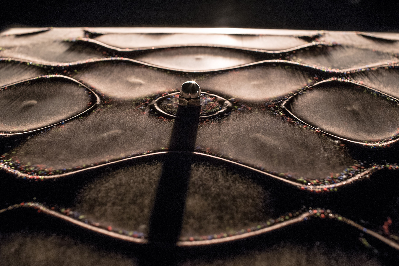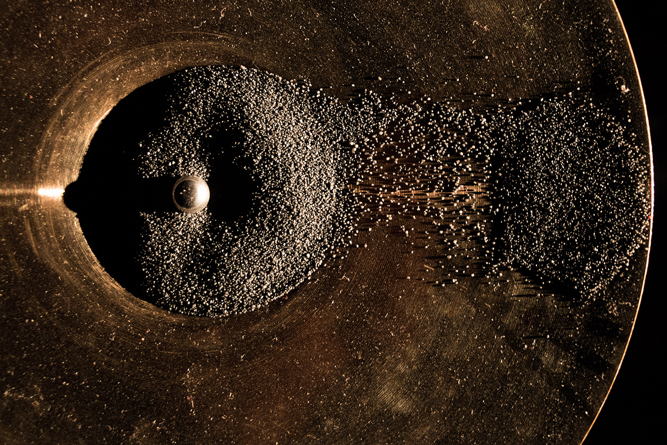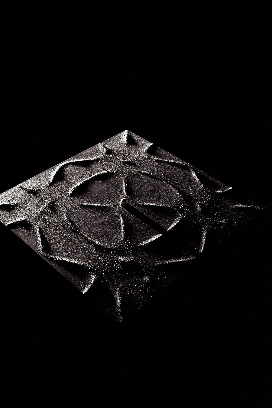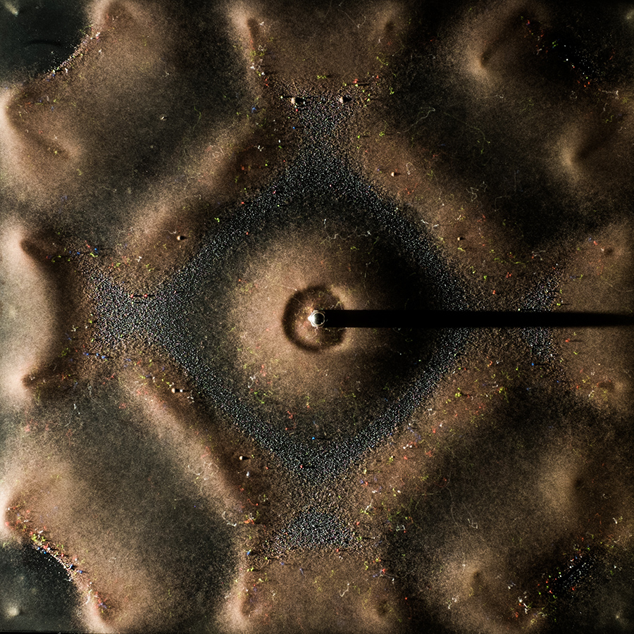 Gli esperimenti sulla fisica e la teoria del suono, condotti dal fisico tedesco Ernst Chladni, nella seconda metà del Settecento, rappresentano le chiavi di accesso all’indagine. Una sottile lastra metallica posta orizzontalmente e cosparsa di sabbia fine, se fatta vibrare per effetto di un suono, determina la disposizione della sabbia in forme regolari di complessità crescente al crescere della frequenza del suono. La sabbia si concentra in alcuni punti e si allontana da altri. Al variare dei suoni trasmessi alla lastra si ha una variazione di forme.