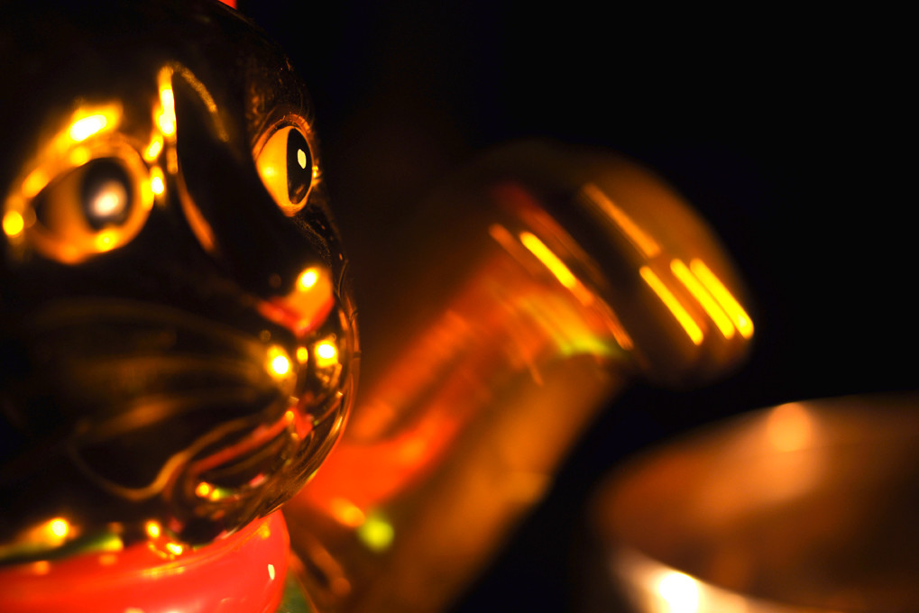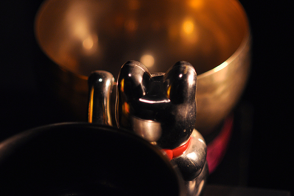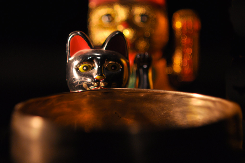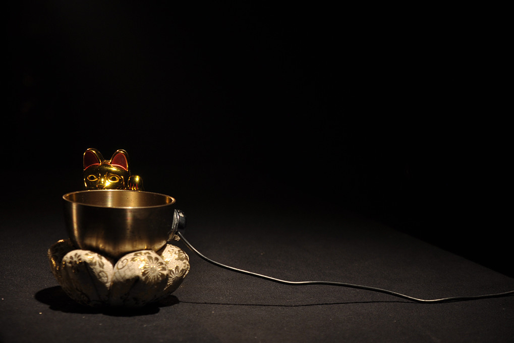 Un esercito di gatti dorati avanza compatto; i suoi cittadini-soldato sono repliche identiche e indistinte, non si fanno domande, agitano solo il braccio semovente in cerca di qualcosa da colpire. Le vittime di questa offensiva stanno lì, immobili. Nella loro ferma non violenza, contrappongono il proprio corpo che si fa strumento di protesta. In questo immolarsi emettono un suono: il suono di una cultura, il suono di una rivendicazione.